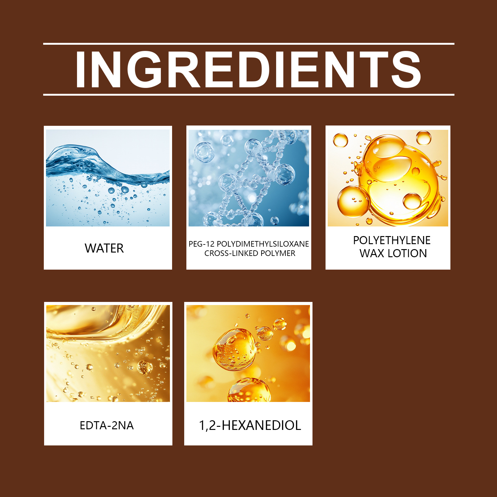 Product information: Ingredients: water, PEG-12 polydimethylsiloxane crosslinked polymer, polyethylene wax emulsion, 1,2- hexanediol, EDTA-2Na.